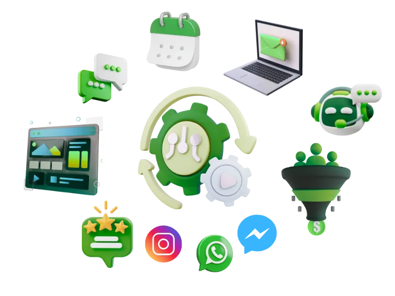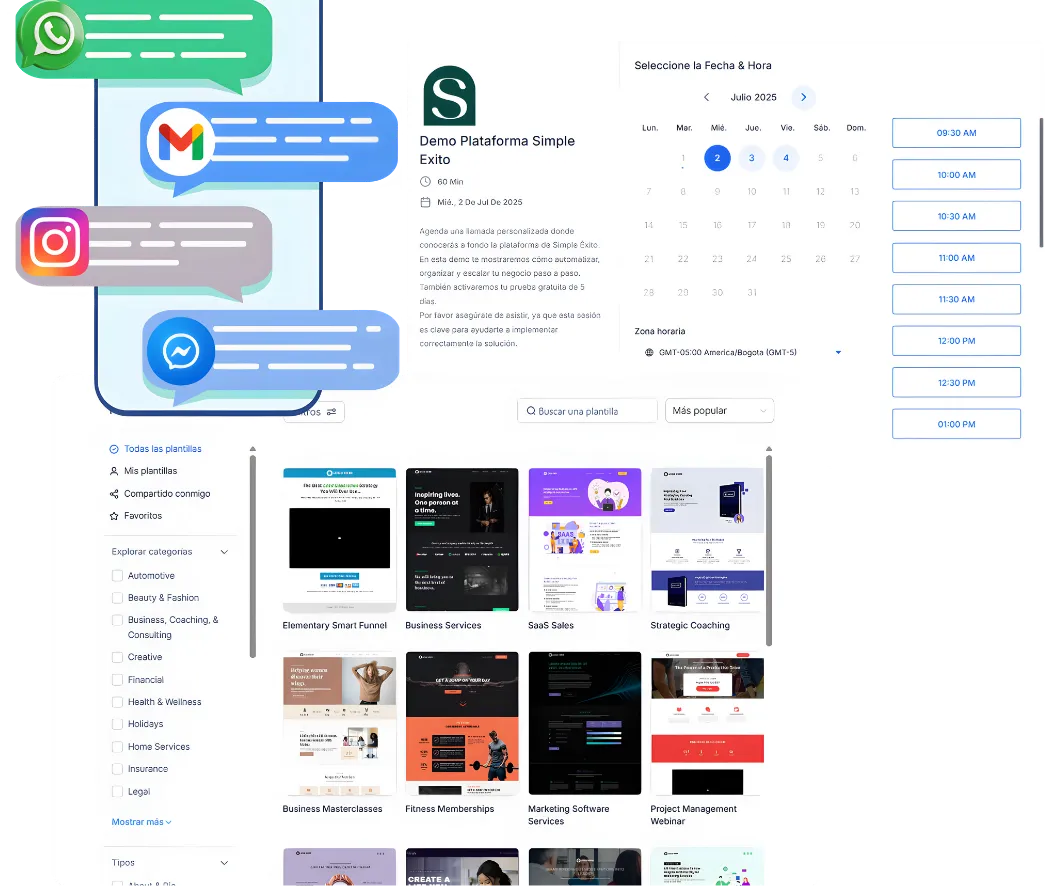 Landing pages, formularios, encuestas, calendarios y mensajes desde WhatsApp, Instagram, Facebook o email — todo integrado en tu CRM personalizado.